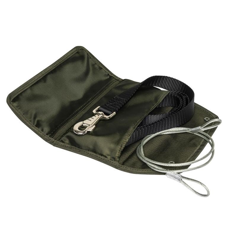 Tira-caza para arrastrar la caza. Fabricada con cuerda de nailon resistente y tiene un cable de acero inoxidable en su extremo. Mosquetón articulado y bolsillo práctico que puede usarse como correa durante el arrastre.